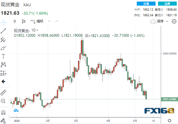 美市尾盘,现货黄金收报1821.63元/盎司,下跌30.71美元或1.66%,日内最高触及1858.66美元/盎司,最低触及1821.19美元/盎司。