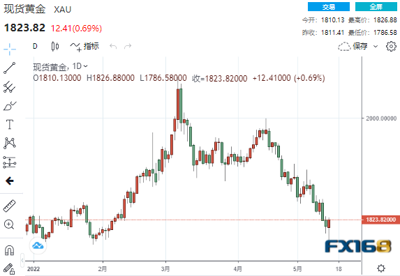 24K99讯 周一(5月16日),由于美元和美债收益率双双下滑,现货黄金震荡收涨,此前一度跌破1800美元大关。