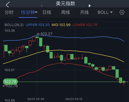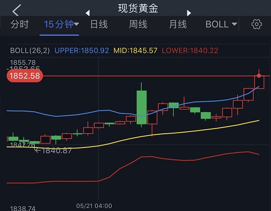 FX168财经报社(香港)讯 周一(5月23日)亚市早盘,美元指数短线一波跳水,目前跌至102.80附近。受美元走软推动,现货黄金快速上涨,金价刚刚突破1850美元/盎司关口,目前升至1852美元/盎司附近。除了美元走软,俄乌谈判相关消息令市场避险情绪升温,这也利好金价走势。