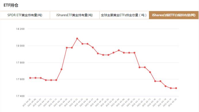 iShares白银ETF5月20日白银持有量为17492.87吨,与上一交易日持平。