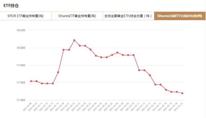 iShares白银ETF5月23日白银持有量为17478.52吨,与上一交易日减少14.35吨。