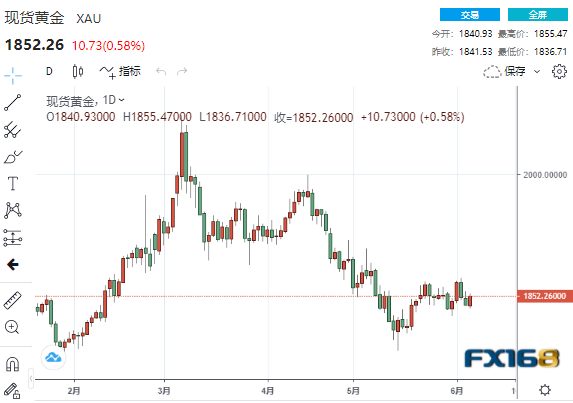 美市尾盘,现货黄金收报1852.26美元/盎司,上涨10.73美元或0.58%,日内最高触及1855.47美元/盎司,最低触及1836.71美元/盎司。