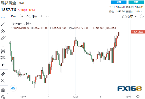 周三美市盘中,现货黄金短线拉升近15美元,并刷新日高至1859.11美元。