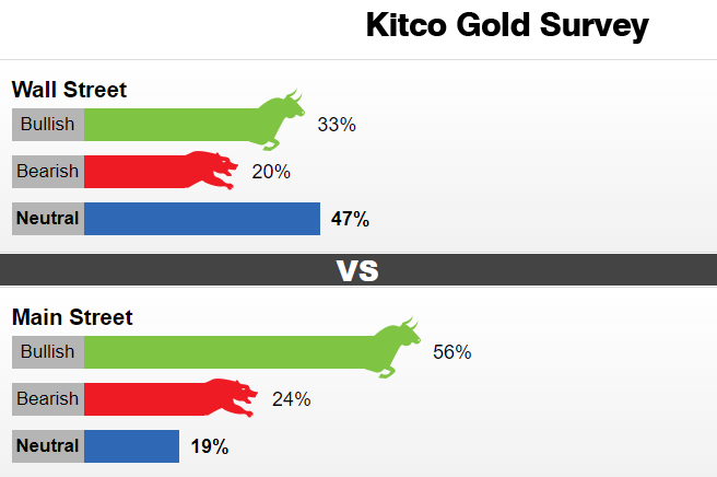 本周,15位华尔街分析师参与了Kitco的黄金调查。在这些参与者中,有5位分析师(33%)看好黄金近期的表现。与此同时,3位分析师(20%)看跌金价,7位分析师(47%)对金价持中性看法。