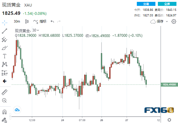 数据公布之后,现货黄金持续下跌并刷新日低至1824.97美元/盎司;现货白银也持续自高位回落至21.24美元/盎司一线交投。