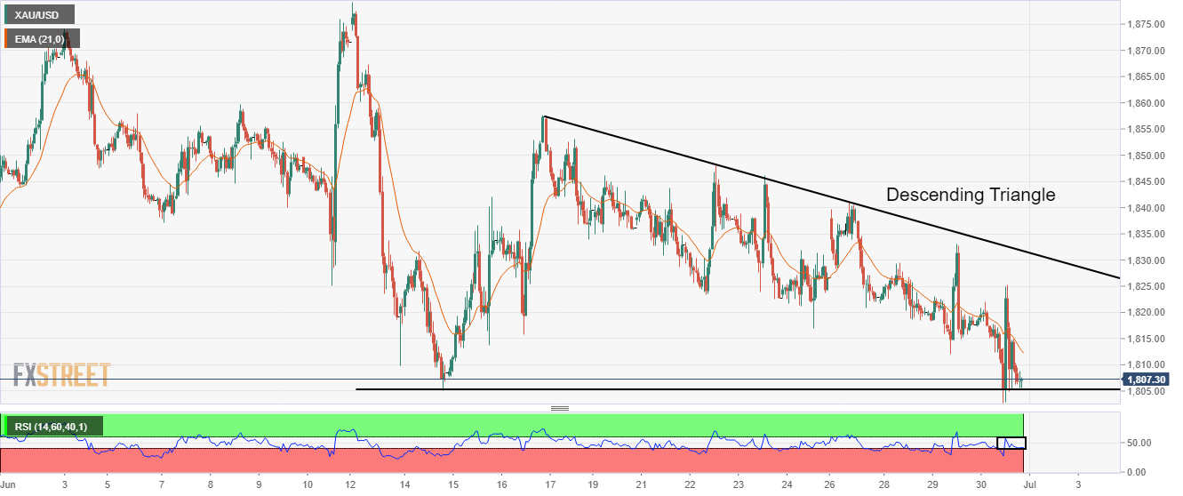 24K99讯 周五(7月1日)亚市早盘,现货黄金继续承压,目前位于1805美元/盎司附近。知名财经网站FXStreet分析师Sagar Dua最新撰文,对金价走势进行分析。