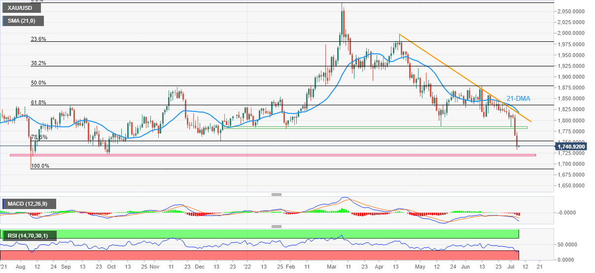 24K99讯 周四(7月7日)亚市盘中,现货黄金延续跌势,现报1737美元/盎司附近。知名财经网站FXStreet分析师Anil Panchal周四最新撰文,对金价走势进行分析。根据Panchal,若金价跌破关键支撑1720美元/盎司,后市面临进一步大跌风险。