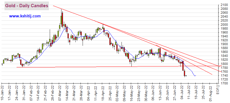Kshitij咨询服务团队在文章中写道,对经济衰退的担忧推高美元,而大宗商品价格暴跌。我们需要观察这种下降趋势是否会在未来几周内持续。黄金期货可能会继续暴跌向1700美元/盎司。