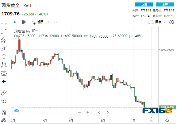 美市尾盘,现货黄金收报1709.76美元/盎司,下跌25.69美元或1.48%,日内最高触及1736.12美元/盎司,最低触及1697.50美元/盎司。