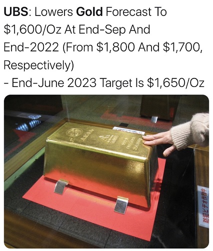 瑞银预计,金价将在9月底和12月底位于1600美元/盎司(此前预测分别为1800美元/盎司和1700美元/盎司),2023年6月底将位于1650美元/盎司(此前预测为1700美元/盎司)。