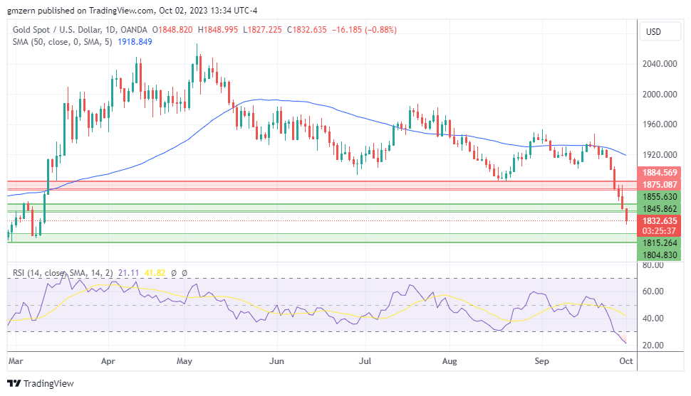 现货黄金价格已经从9月份的高点1947.00美元下跌了6%以上,如果多头未能从这里成功地反弹,那么金价今年将由涨转跌,并进一步跌至低于今年的底部1804.76美元。