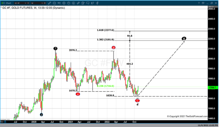 上图中的艾略特波浪计数显示,我们刚刚完成了修正的第4波,其在最近的低点1621美元结束。然后,Wager使用斐波那契扩展,将第一季度在1670美元的黄金反弹标记为A,并将其在今年3月升至2076美元的走势标记为B。然后他将从最近的低点1621美元开始的反弹标记为C。他在研究中使用的扩展假设最后的第5波将使黄金价格在 1.382%(2181美元)和 1.618%(2277美元)之间移动。