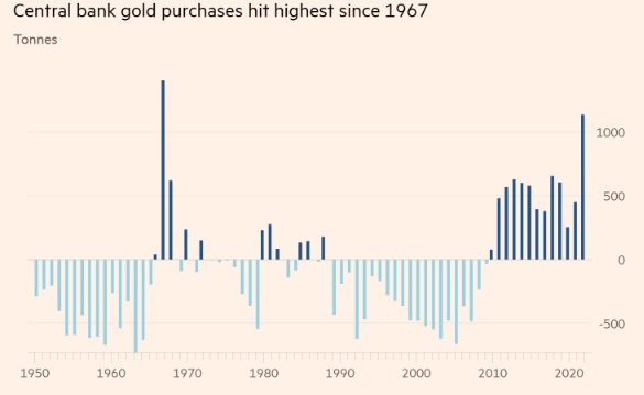 世界黄金协会(World gold Council)的数据显示,各国央行购买的黄金数量在2022年同比增长152%,至1136吨,达到1967年以来新高。