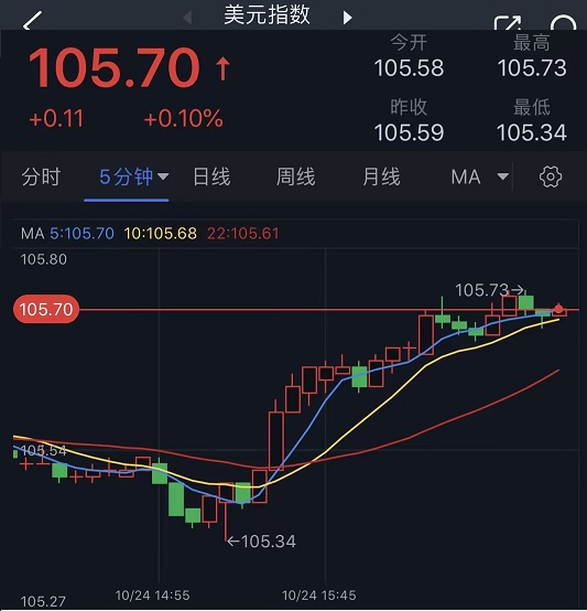 美元指数短线持续反弹,目前位于105.70附近。美元走强令金价承压。