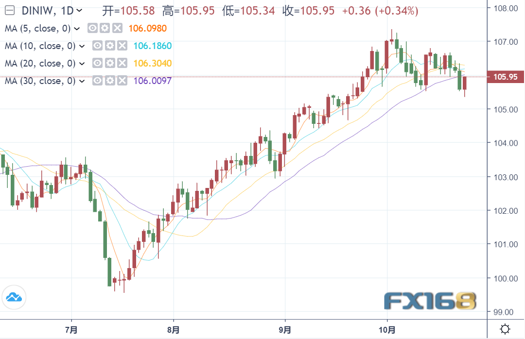 追踪美元兑一篮子六种货币走势的美元指数最新上涨0.04%,至105.63。盘中早些时候跌至105.35,为9月22日以来的最低水平。
