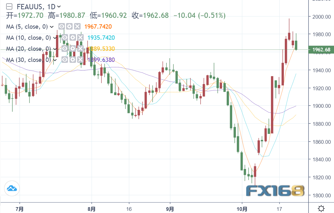 在连续4日上涨后,现货黄金日内小幅回落,刚刚短线急跌失守1960,日内波动幅度超过20美元。