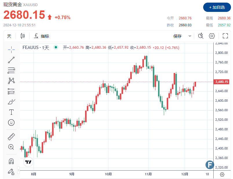 截至发稿,现货金上涨 0.75% 至每盎司 2,680.15 美元。
