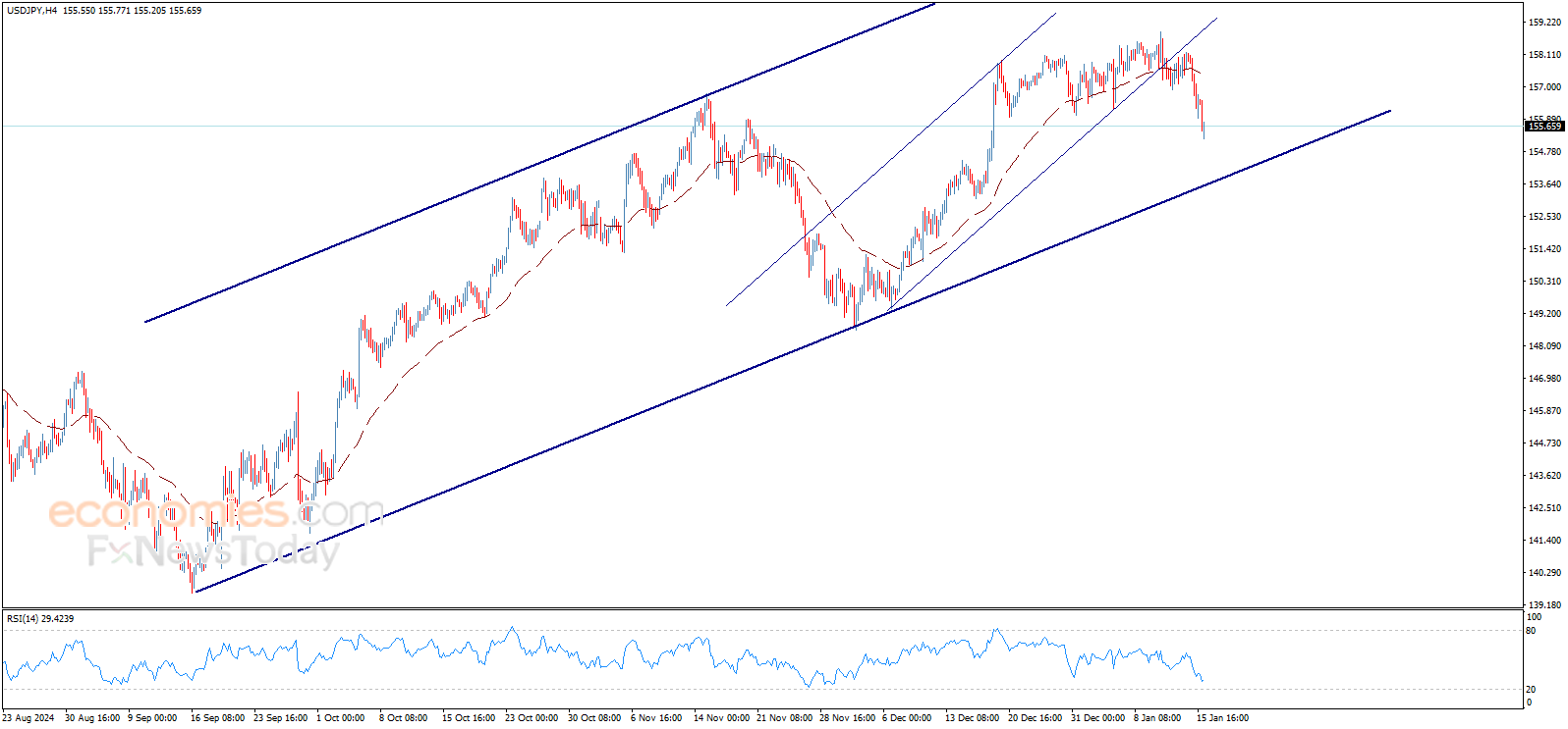 美元/日元强势跌破157.35,并开始看空调整,有望测试主要看涨通道支撑线,并测试主要目标153.75。