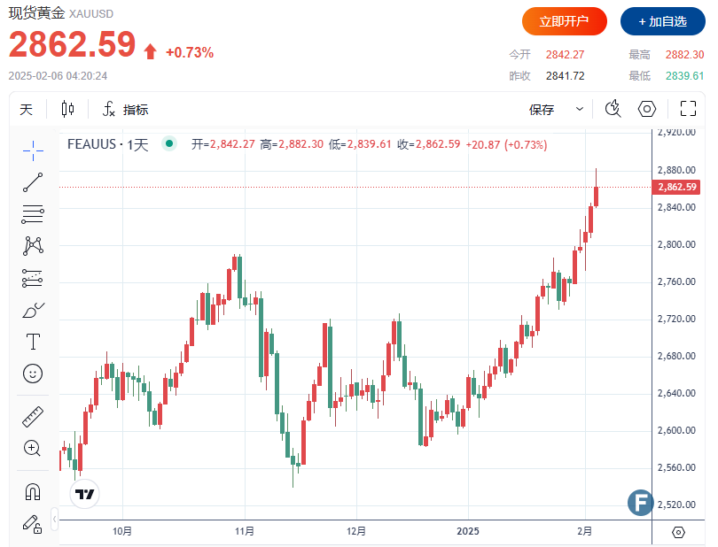截至发稿,现货黄金上涨0.73%至2,862.59美元/盎司,盘中一度触及历史新高2,882.30美元/盎司。