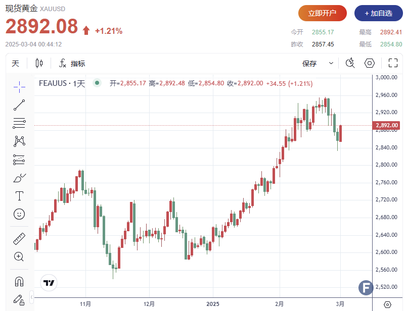 截至发稿,现货黄金上涨1.21%至每盎司2,892.08美元,较日内低点上涨近40美元。