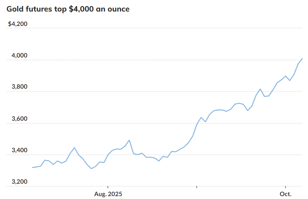 周二,12月交割的黄金期货在Comex盘中一度触及4,014.60美元,收于4,004.40美元,涨幅0.7%。据道琼斯市场数据,按最活跃合约计算,金价年初至今上涨近52%。