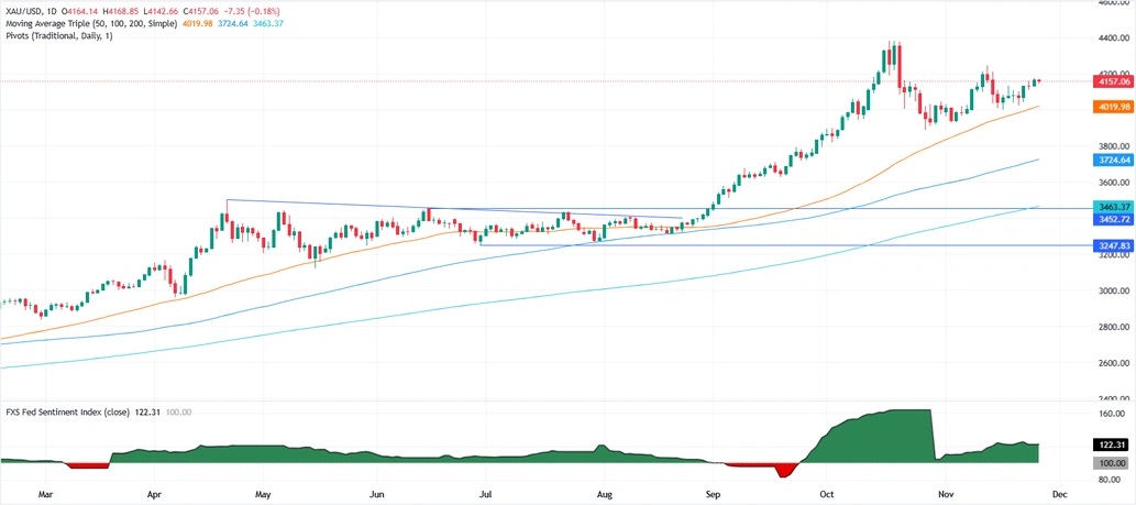 FXStreet分析师Christian Borjon Valencia指出,黄金价格目前徘徊在4160美元/盎司附近,尽管相对强弱指数(RSI)呈看涨趋势,表明买方占据主导地位,但交易员仍未能突破4200美元/盎司大关。