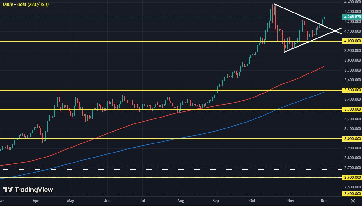 10 月初金价一举突破 4,000 美元 后迅速拉升,其后在 10 月至 11 月间进入旗形/楔形整理。但在 11 月收官前,多头开始发力,如今金价再度突破 4,200 美元,呈现技术性向上突破迹象。
