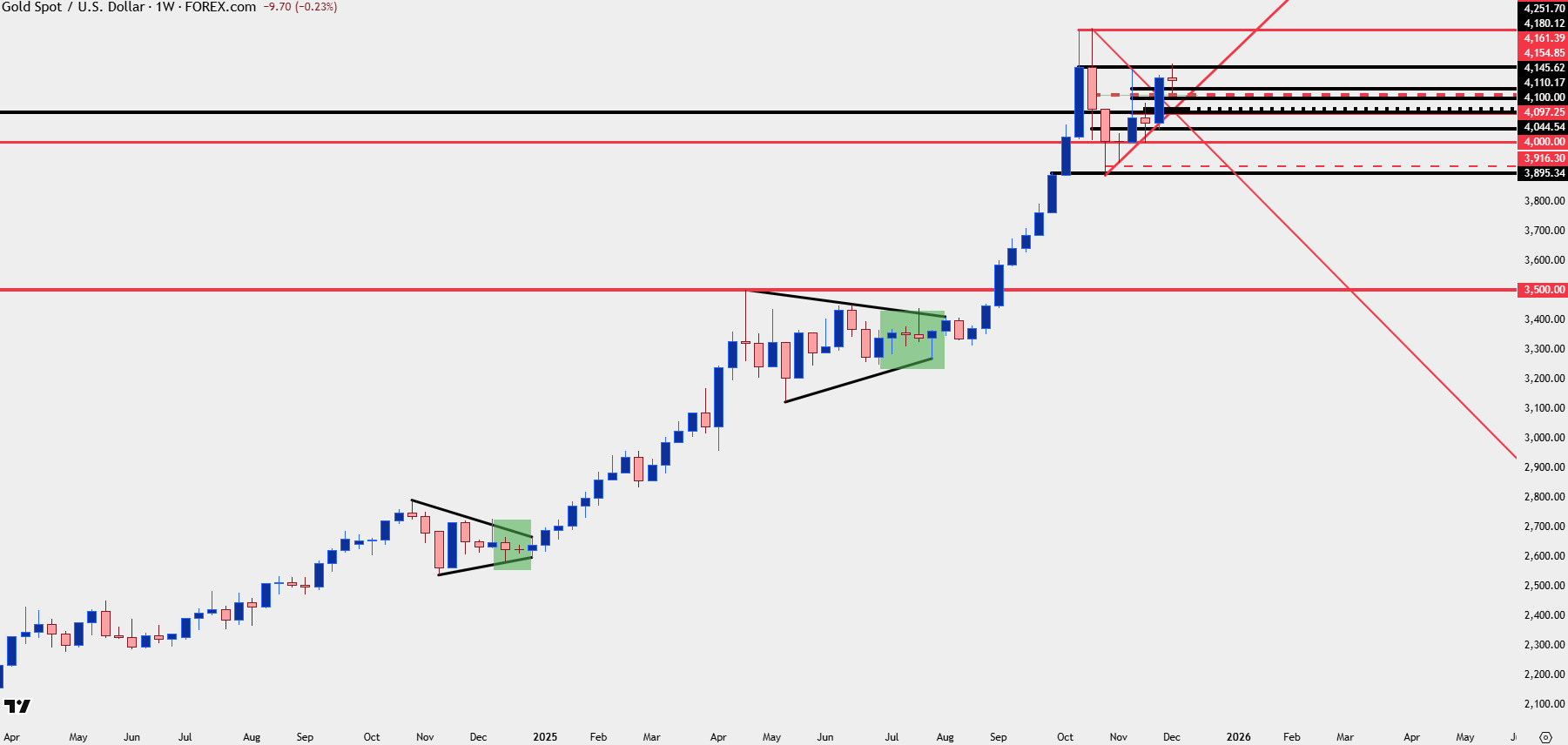 在那波抛物线式上涨中,市场极度单边,而当金价停滞时,获利回吐加剧。但值得注意的是,整个过程中金价没有任何一周收盘跌破 4000 美元,这表明买家持续利用回调加仓。同时,更高的低点再次出现,形成第三个对称三角形,也就是第3个看涨旗形。