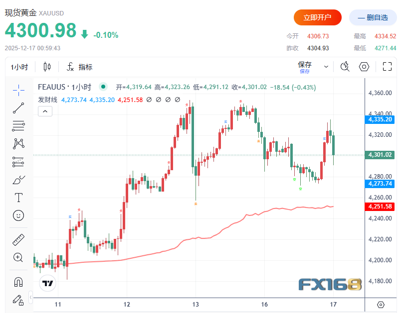 FX168财经报社(北美)讯 周二(12月16日),国际金价冲高回落,美国最新公布的就业数据在表面上略好于预期,但结构性放缓信号持续显现,强化了市场对美联储未来降息的押注。随着美元指数与美债收益率回落,金价在4,300美元/盎司附近反复测试关键支撑位,市场多空分歧加剧。