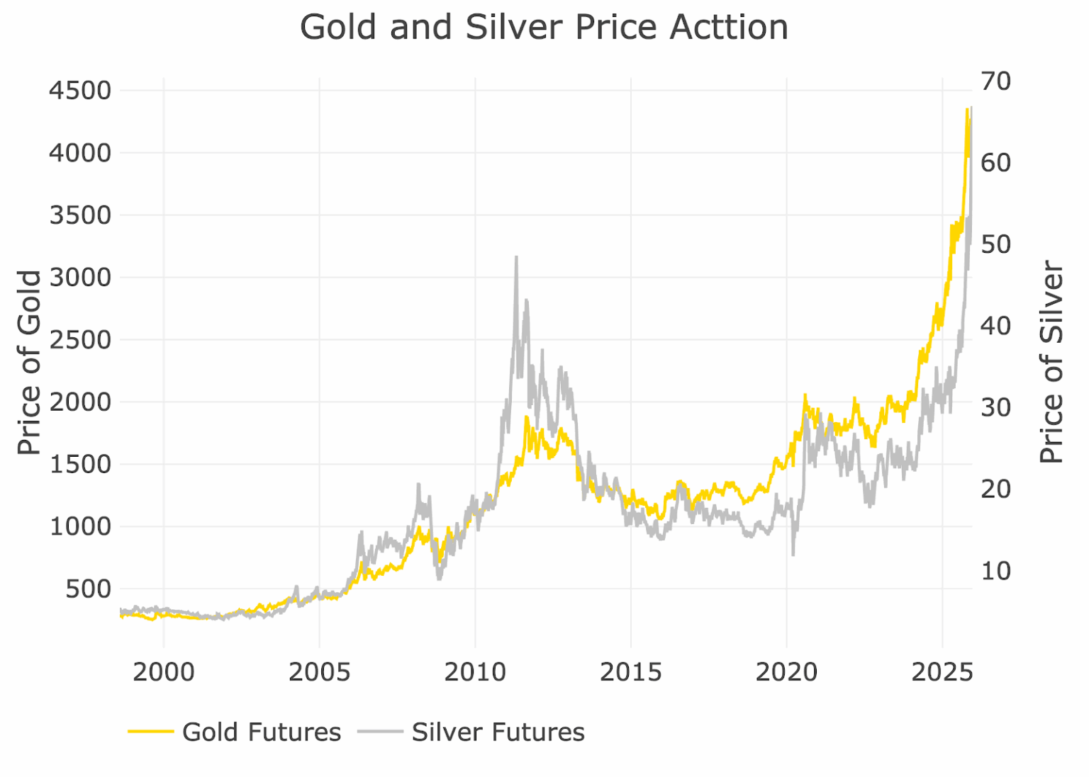 不过,价格连续单边上行并不可持续。若金银价格以“直线上涨”的方式逼近黄金5000美元、白银100美元等重要里程碑,反而可能构成典型的“加速冲顶”信号,增加随后深度调整的风险。从健康牛市的角度看,阶段性横盘或温和回调,更有利于趋势延续。