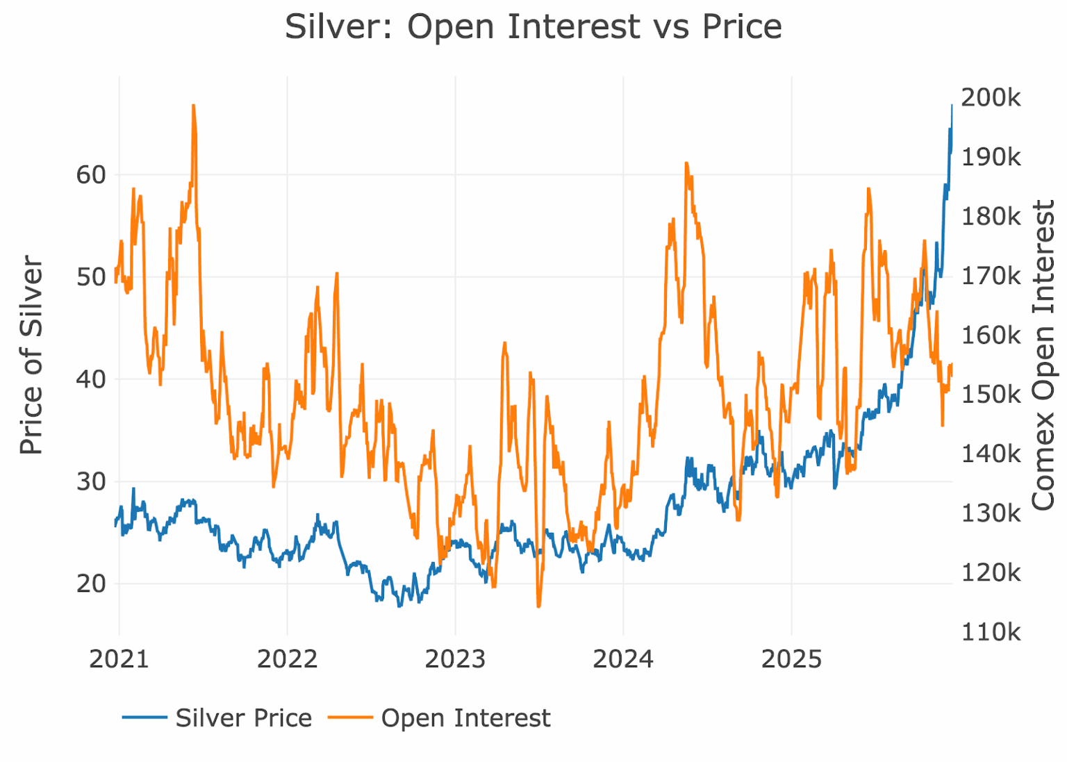 从COMEX持仓数据看,近期金银价格上涨并未伴随显著的未平仓合约扩张,显示推动行情的并非典型的高杠杆投机资金。