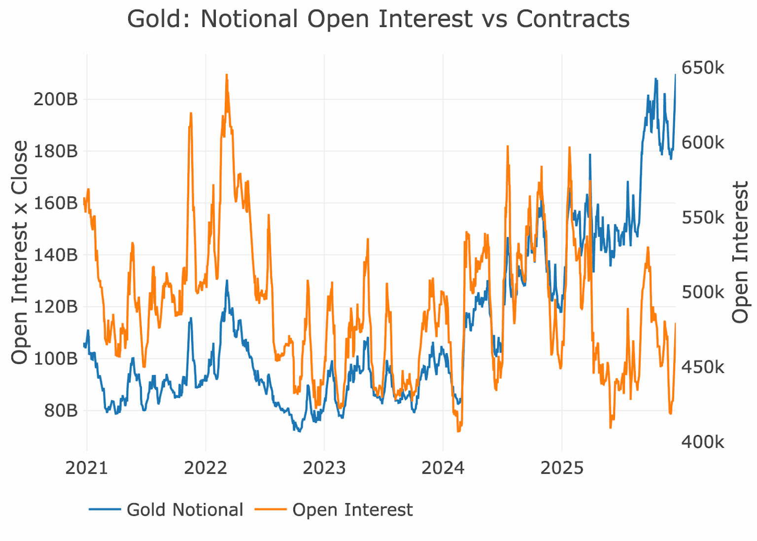 在名义金额层面,由于价格上涨,黄金期货名义持仓规模已突破2000亿美元的历史高位,这可能促使部分交易者进行风险控制或阶段性获利了结。但总体来看,未平仓合约水平偏低,意味着市场中“热钱”密度有限,降低了剧烈踩踏的风险。