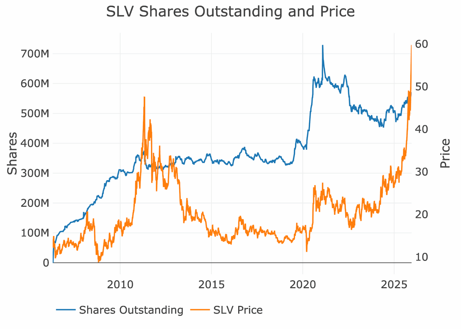 从ETF角度观察,GLD与SLV的份额变化显示,零售资金虽开始回流,但整体参与度仍明显低于2020年以及2010—2012年的高峰时期。