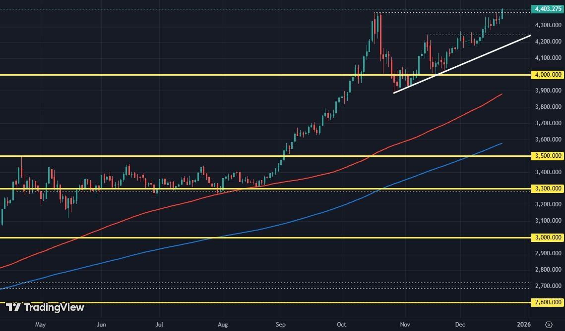 随着假日季临近,黄金和白银交易员并未放慢脚步。进入新的一周,贵金属继续强势上攻,金价已飙升至4,400美元上方,刷新历史新高,涨势可谓势不可挡。此前已多次提到,展望明年,黄金具备多重利好因素。然而从目前走势来看,多头似乎并不愿等待,而是继续追逐新的突破,以把握下一轮上行空间。