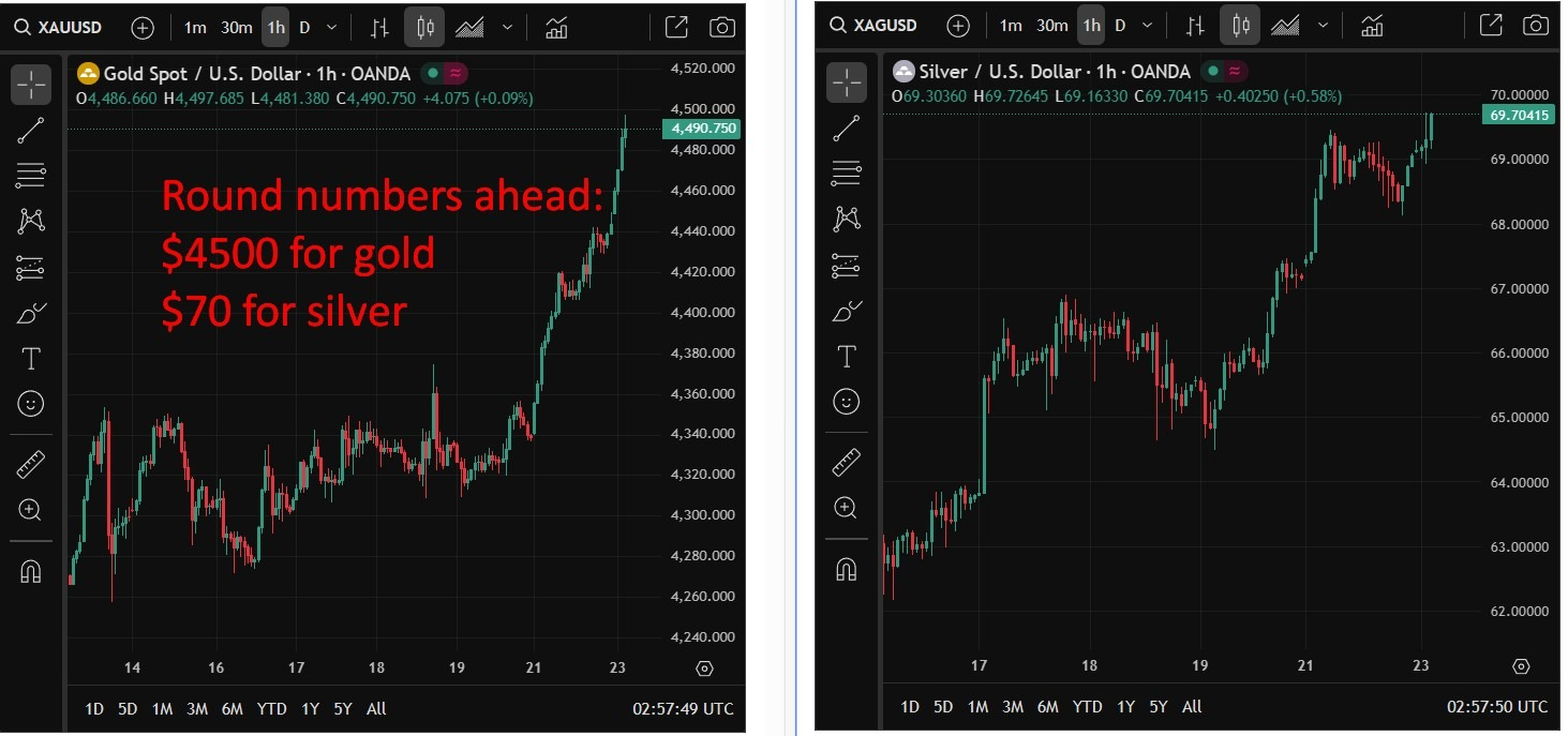 技术面显示,金银价格正逼近具有心理意义的阻力水平。整数价位往往容易成为市场的心理阻力区间。当前,黄金面临的关键整数关口在 4,500 美元/盎司,而白银则在 70 美元/盎司。