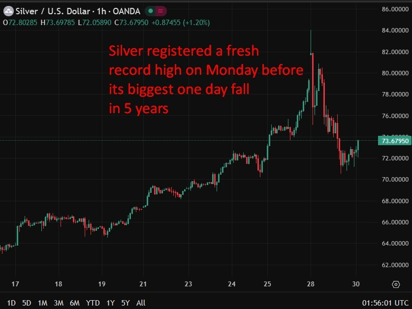 FX168财经报社(亚太)讯 周二(12月30日)白银价格在经历五年来最剧烈的单日下挫后企稳回升。此前白银周一遭遇约9%的暴跌,为2019年以来最大单日跌幅,市场普遍认为本轮回调主要由年末获利了结与仓位调整驱动,而非基本面发生实质性恶化。