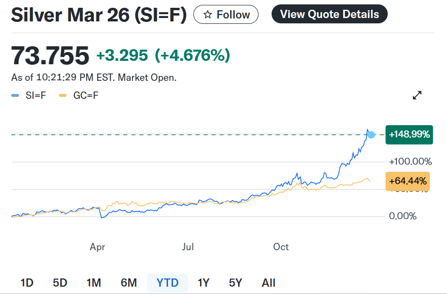 尽管短期大幅回调,贵金属在2025年整体仍表现突出:黄金年内上涨约67%,受央行持续购金与美元走弱支撑;白银年内涨幅接近150%,在工业需求强劲与供给短缺背景下成为年度“明星品种”;此外,铜、铂金等金属今年也纷纷刷新纪录高位。