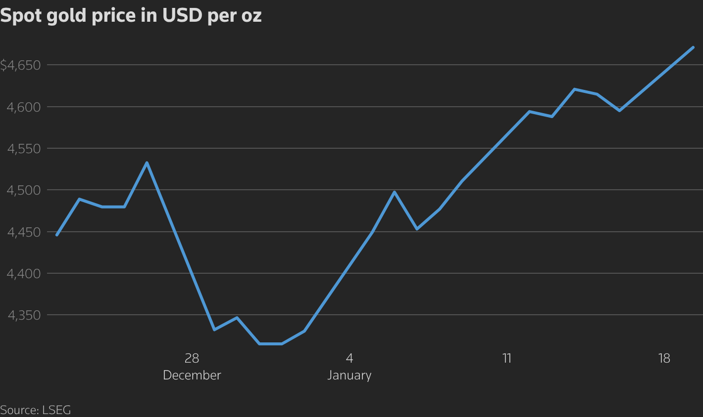 FX168财经报社(欧洲)讯 周一(1月19日)黄金和白银价格双双升至历史新高。美国总统唐纳德·特朗普就格陵兰控制权问题威胁对欧洲国家加征额外关税后,投资者涌入避险资产,推动贵金属再度走强。