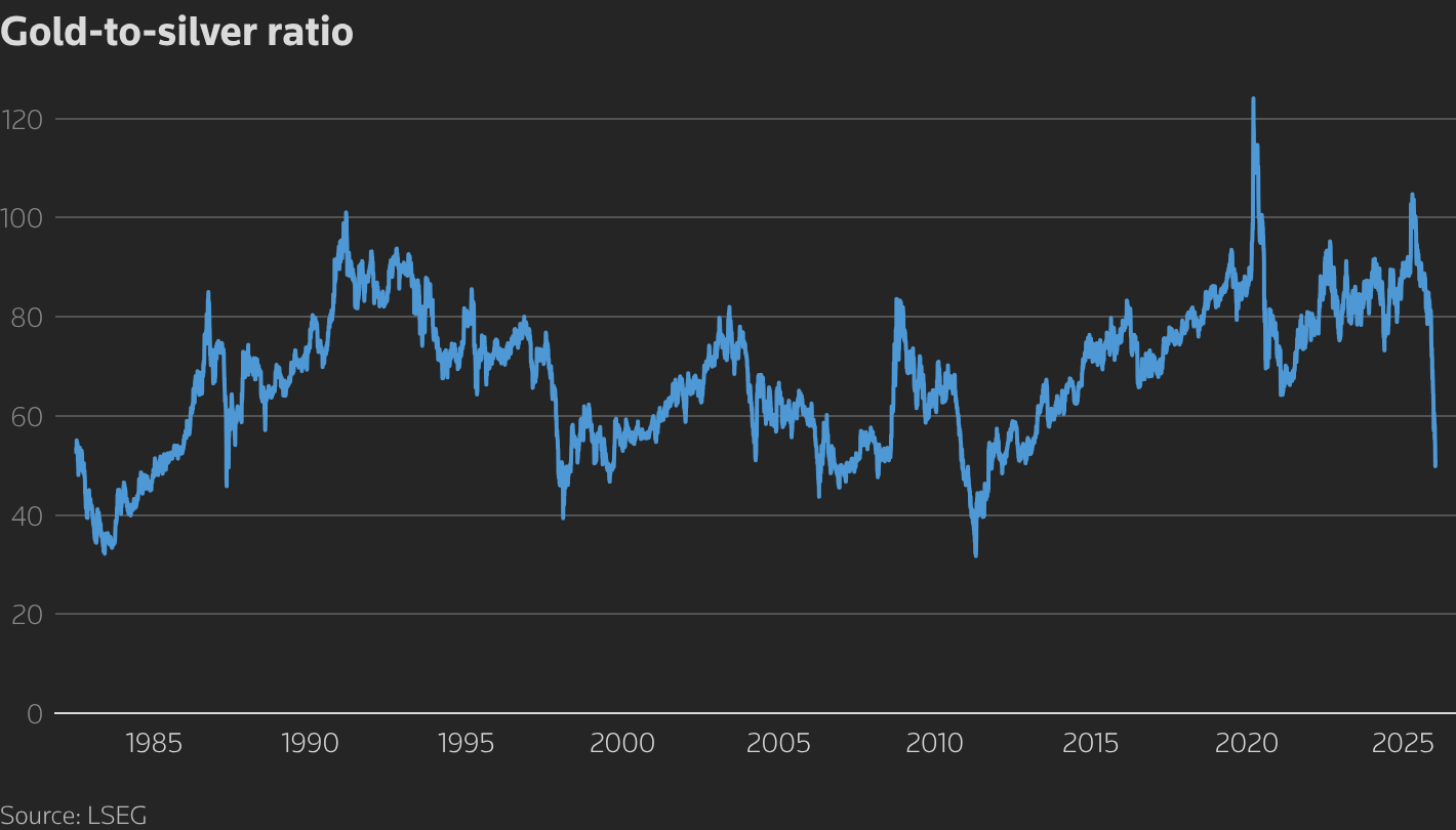Wong指出,金银比已从2025年末接近105的高位大幅下行至50出头的低位区间,反映白银相对黄金的表现更为强势。