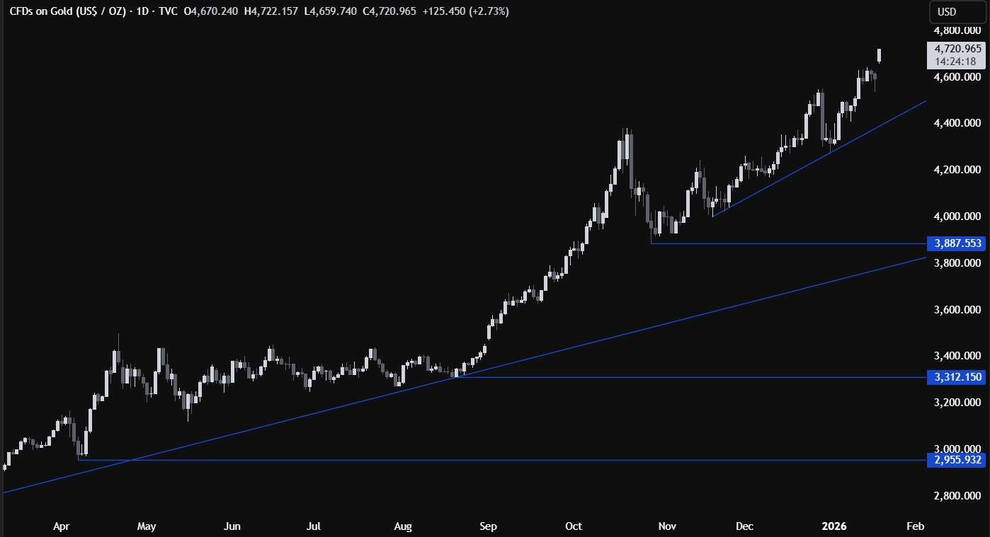 在日线图上可以看到,上周末特朗普就格陵兰问题升级表态后,黄金昨日跳升并刷新历史新高。从风险管理角度来看,多头在趋势线附近布局、博取金价再创历史新高,将具备更优的风险回报比;不过,如此幅度较大的回调,往往需要上述提到的某个催化剂出现。