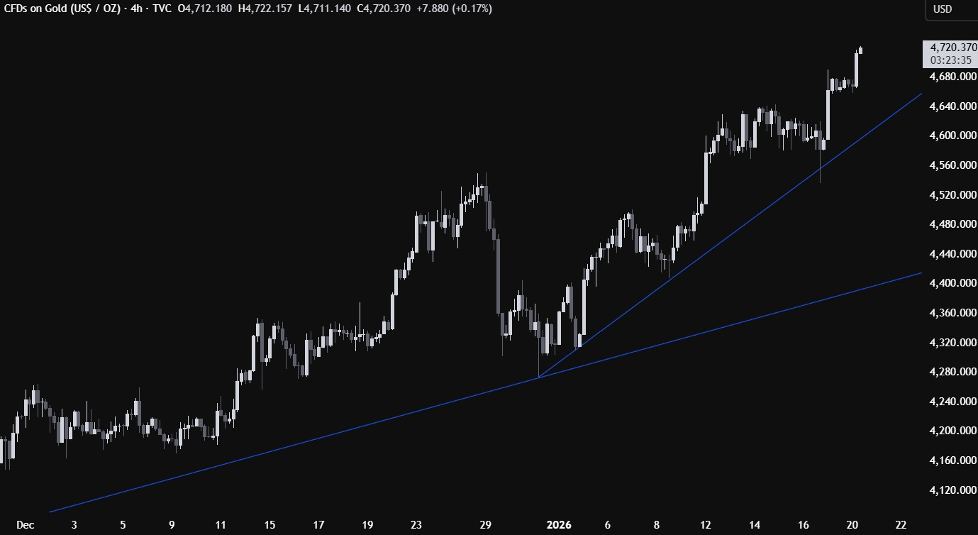 在4小时图上,可以看到一条小级别上升趋势线,界定了该时间框架内的多头动能。上周五,在特朗普表示可能让哈塞特继续留任现职后,金价因特朗普相关消息的刺激出现波动,并回踩至趋势线附近。多头在趋势线附近入场,并以其下方作为明确的风险控制位,目标指向新高。如果再度出现回调,预计买盘仍将依托该趋势线继续推动价格刷新纪录高位;而空头则需要有效跌破该趋势线,才有可能打开通向更大幅度回调、指向主要趋势线的空间。