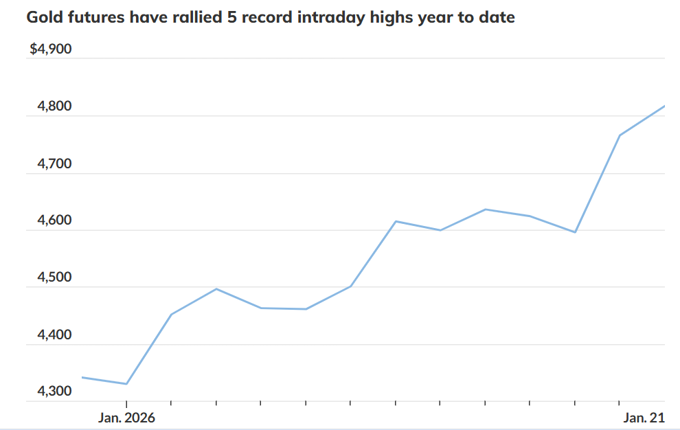 而周三下午的市场表现确实如此。到周三下午晚些时候,金价虽从纪录高位回落,但仍保持本周以来的稳健涨势,交易价格仍在4,800美元上方。2月交割的COMEX黄金期货周三收于纪录新高4,837.50美元/盎司,当日上涨1.5%。盘中一度高见4,891.10美元——据道琼斯市场数据,这已是今年迄今为止黄金第五次刷新盘中纪录高位。