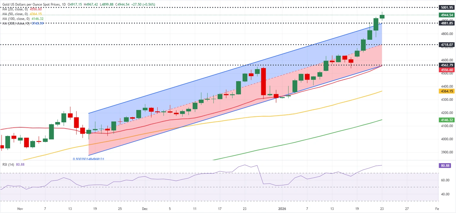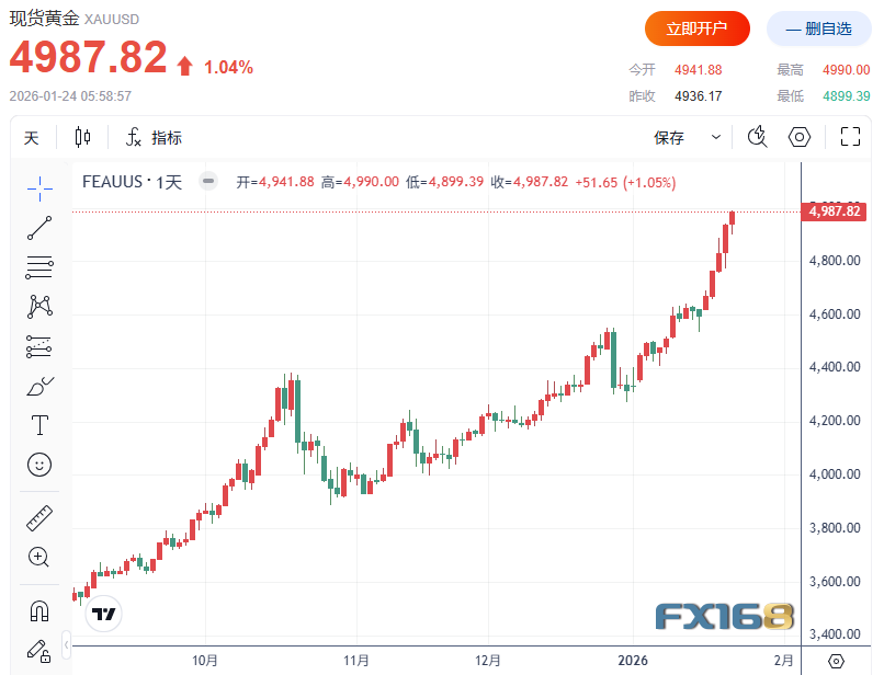 FX168财经报社(北美)讯 黄金本周强势开局并持续走高,周五(1月23日)一度刷新历史纪录至4990美元,距离5000美元整数关口仅一步之遥。分析人士指出,短期内金价波动可能维持高位,市场焦点将集中在地缘局势演变与美联储利率决议及政策信号上。