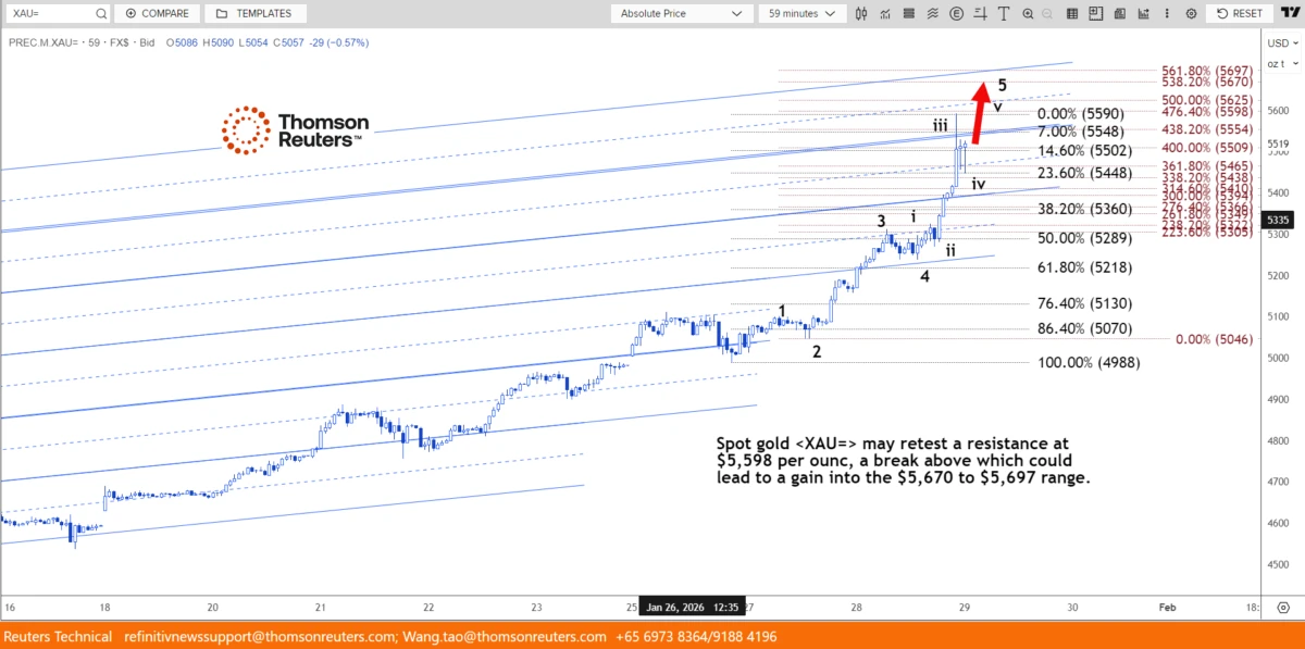 路透分析师指出,现货黄金可能再次测试5,598美元/盎司的阻力位;一旦向上突破该水平,金价可能进一步上行至5,670–5,697美元区间。该阻力位被界定为自5,046美元起涨的上升趋势对应的476.4%投射位。波浪形态显示,市场正运行在自4,988美元以来的一个小型“五浪结构”的最后一浪之中。