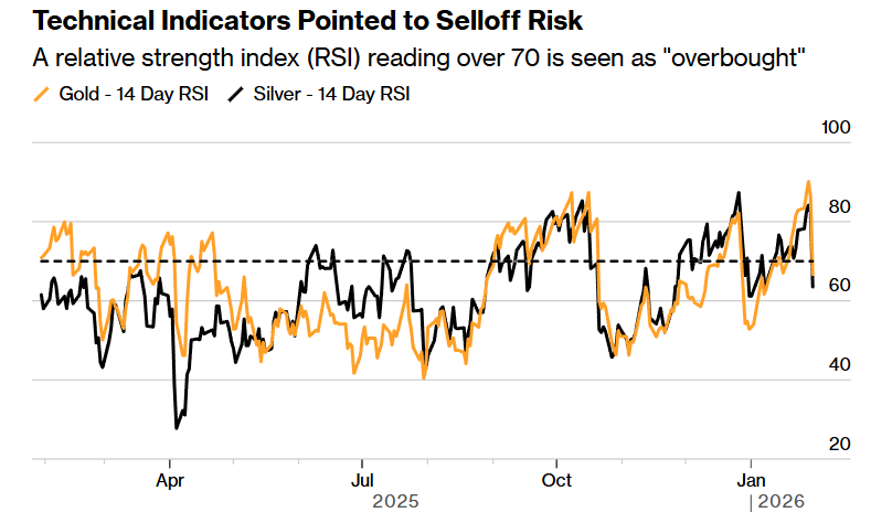 由于今年以来黄金与白银涨幅过大,一些技术指标已发出风险警报。其中之一是相对强弱指数(RSI):最近几周该指标提示两种金属可能已进入“超买”区间、回调在所难免。黄金RSI近日一度触及90,为几十年来罕见的高位。