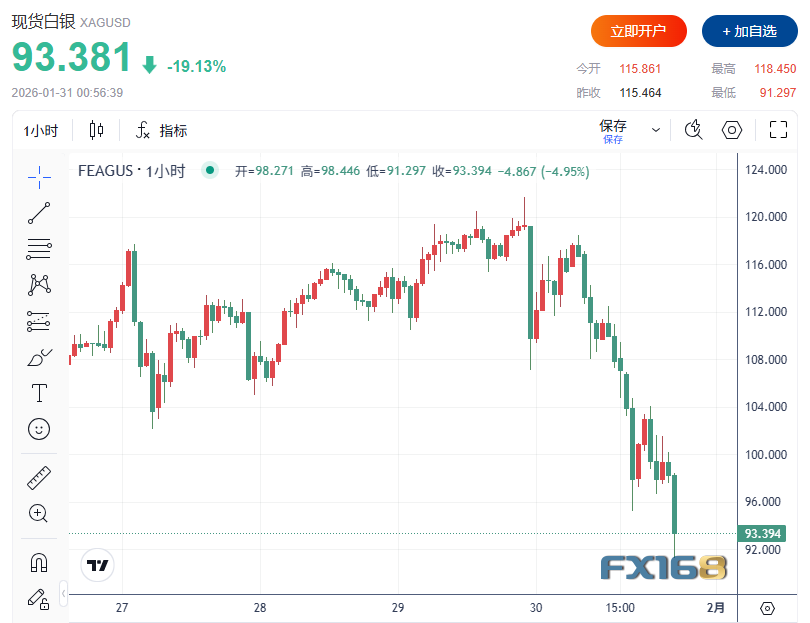 截至撰稿,现货白银大幅下跌超21%,至91.297美元/盎司低点。