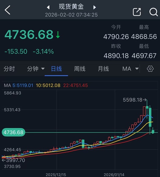 金价最低触及4697.67美元/盎司,日内跌幅达到192美元;上周四金价最高曾触及创纪录的5598.18美元/盎司。银价目前下跌7.7%,报78.64美元/盎司。