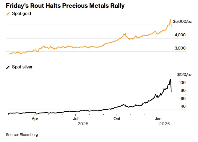 贵金属的抛售由一则消息引发:美国总统特朗普(Donald Trump)将提名凯文·沃什(Kevin Warsh)出任美联储主席。该消息推动美元走强;上周五美元指数录得自去年5月以来最强劲的一天。