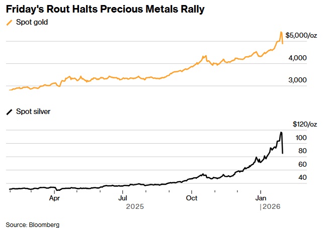 价格短暂企稳,但随后彭博社及其他媒体报道称,特朗普计划提名沃什出任下一任美联储主席。此前,亚洲早盘交易时段通常都会推动价格继续走高——疲惫的欧洲交易员常常只能惊讶地旁观——但这一次,中国投资者选择获利了结。上周五那场戏剧性崩盘的种子,就此埋下。