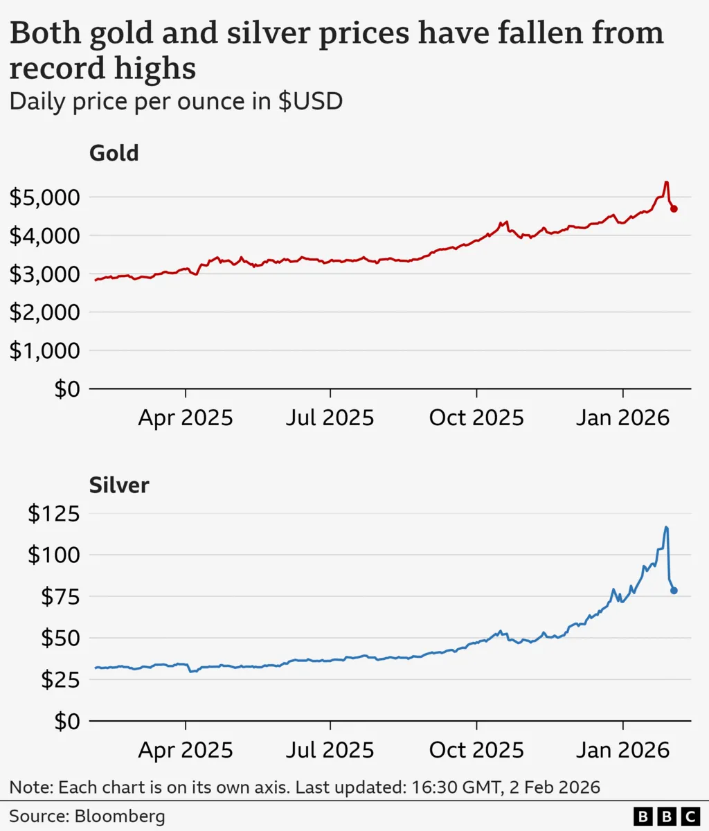 数据显示,自2025年2月以来,黄金和白银价格持续上涨:黄金从2815美元/盎司、白银从32美元/盎司起步,在2026年1月28日分别触及5417美元/盎司和117美元/盎司的高点。随后价格回落,周一(2月2日)美盘时段,黄金和白银分别交投于4650美元和78.30美元一线。
